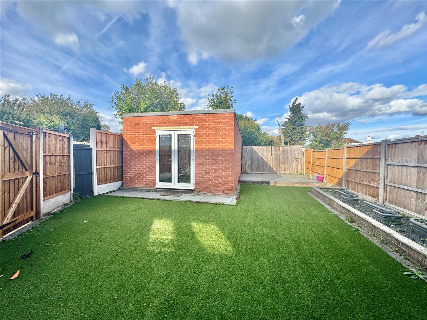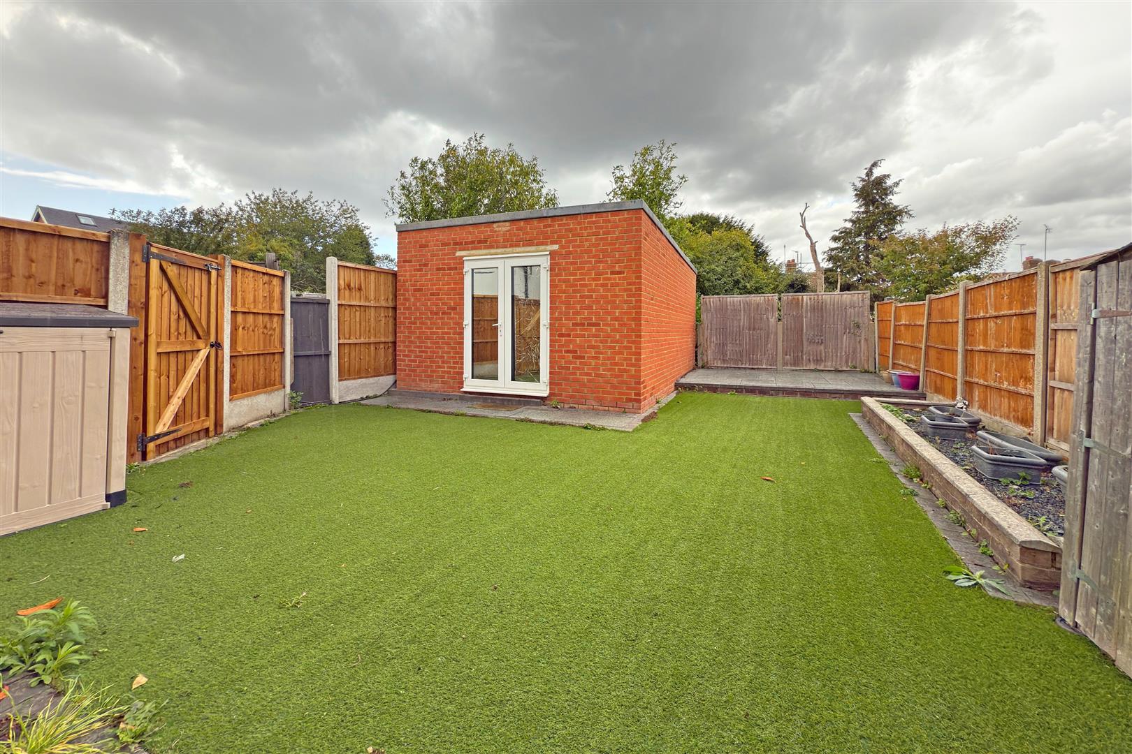 Concreted area to the direct rear of the property, slabbed seating area at the end of the garden, the remainder is mainly artificial turf, pedestrian side access via gate, outside lighting.