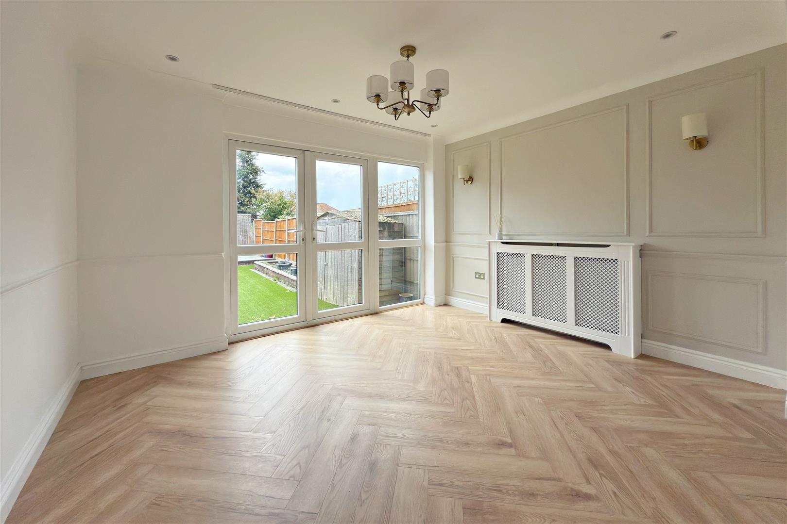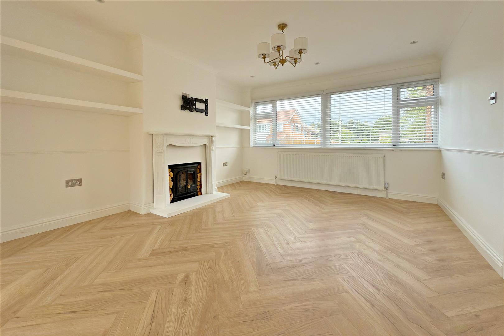Double aspect double glazed windows to front and rear, double glazed patio doors to rear garden. Smooth ceiling, coving, spotlights, part wood panelling to walls, wall lights, decorative mock wood burner with surround, two radiators with thermostatic valves, laminate flooring.