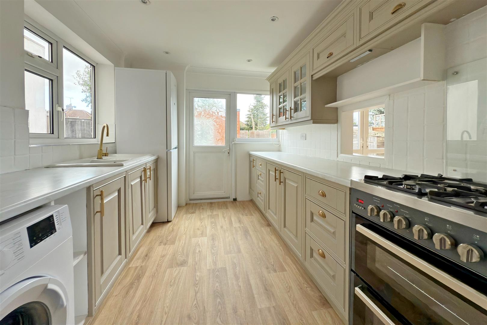 Double glazed windows to two aspects, double glazed door to rear garden. Smooth ceiling, coving, spotlights, range of base and eye level wall cabinets with worktops, cabinet enclosing wall mounted boiler, ceramic single drainer sink, space for freestanding oven (to remain), space for freestanding fridge/freezer (to remain), space for freestanding washing machine (to remain), part tiled walls, vinyl flooring.