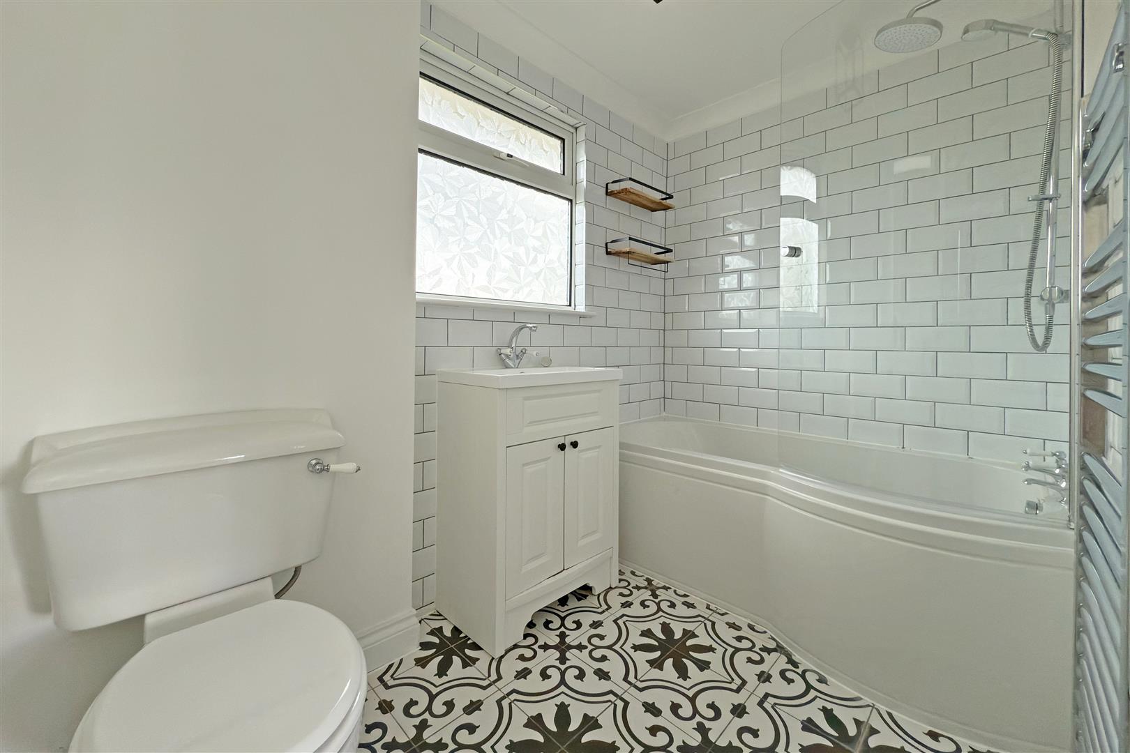 Double glazed windows to two aspects. Suite comprising of P-shape bath, separate overhead shower with waterfall head and handheld, glass screen, wash basin with cupboard beneath and low level wc, smooth ceiling, coving, part tiled walls, heated towel rail, tiled floor.