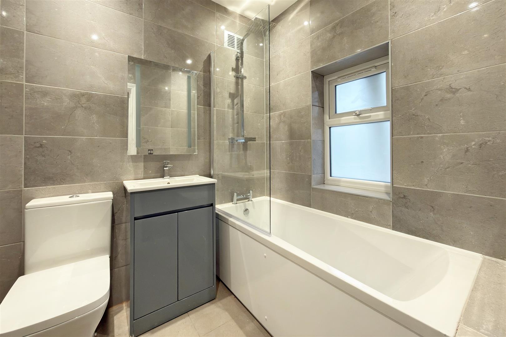 Double glazed window. Suite comprising of bath with glass screen and overhead separate shower, wash basin with cupboard beneath and low level wc, smooth ceiling, spotlights, extractor, tiled walls, wall mirror with LED lights and electric shaving point, heated towel rail, tiled floor.