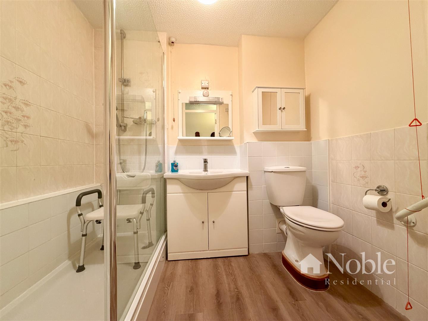 Low level WC, vanity wash hand basin, walk in shower enclosure, extractor, electric heater, emergency pull cord, part tiled walls, vinyl flooring.