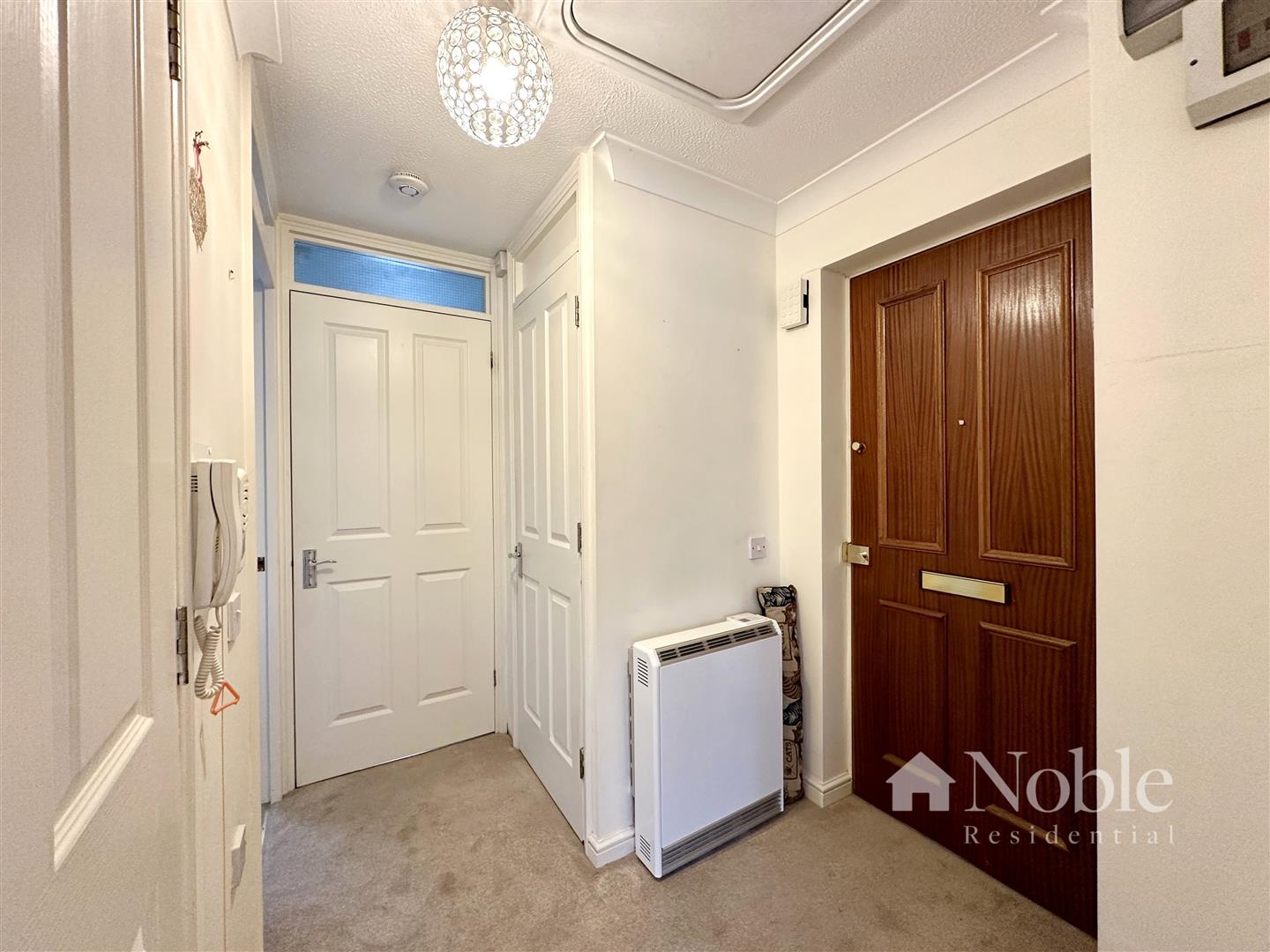 Entrance door, two storage cupboards, electric storage heater, emergency pull cord, intercom system, loft access, coved ceiling, carpet.