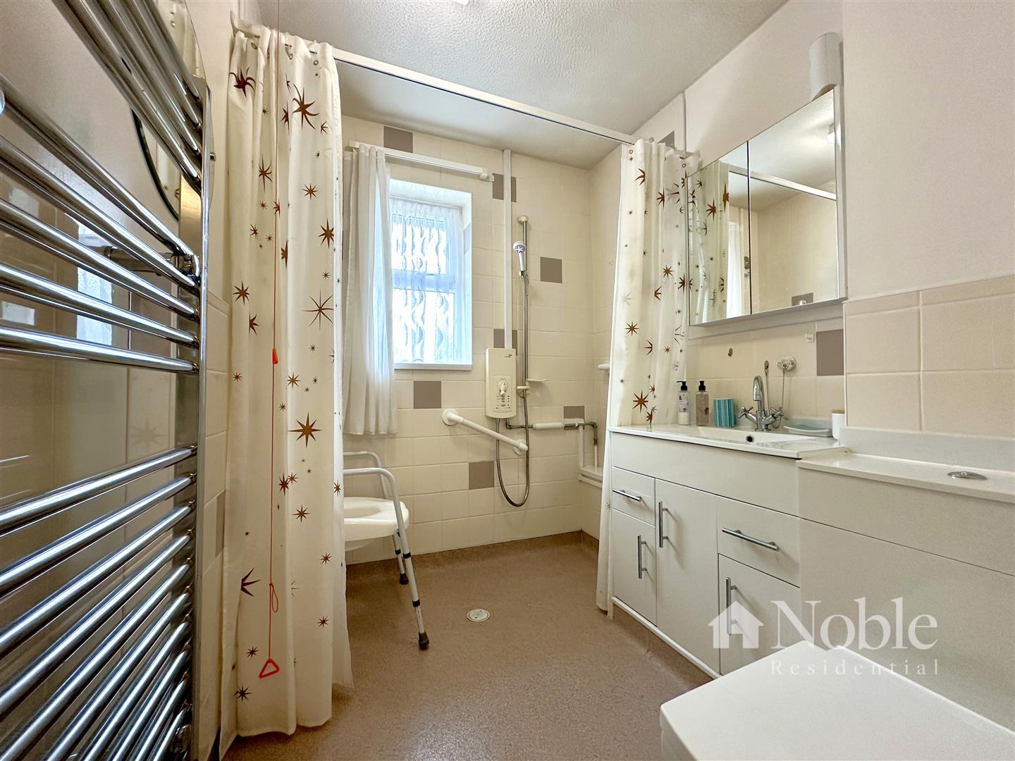 Frosted double glazed window to rear, low level WC, vanity wash hand basin, walk in shower, heated towel rail, emergency pull cord, par tiled walls, vinyl flooring.