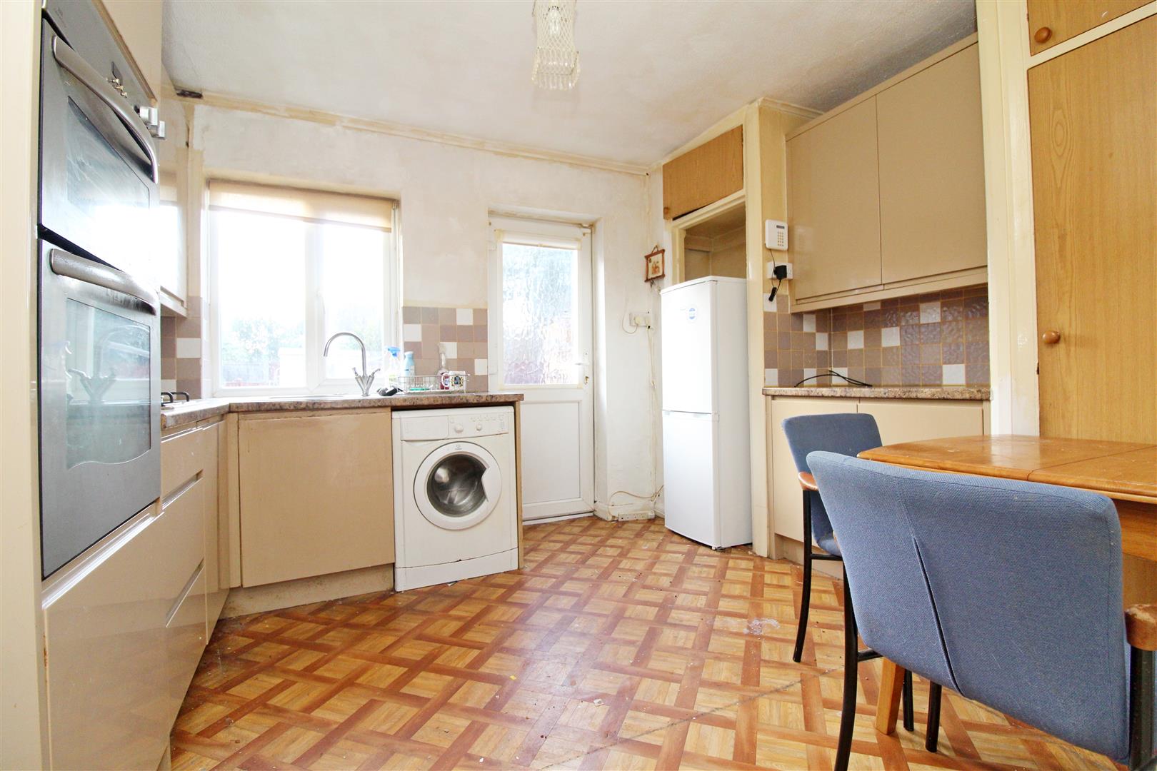 Double glazed window and door to rear, vinyl flooring, stainless steel single drainer sink, plumbing for washing machine, wall and base units,