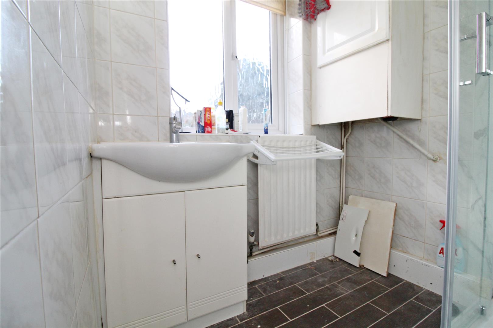 Frosted double glazed window to rear, vanity wash hand basin, shower cubicle, tiled flooring, tiled walls, radiator, boiler.