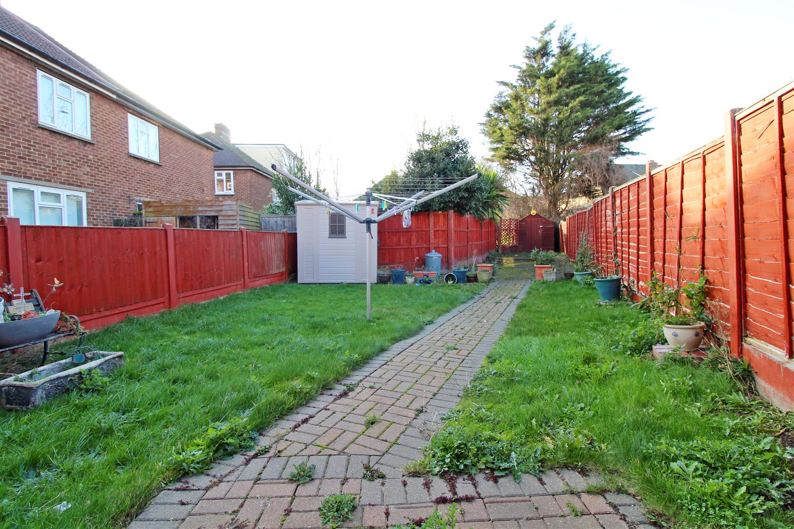 Patio area, mainly laid to lawn, shed, side pedestrian access leading to front of property.
