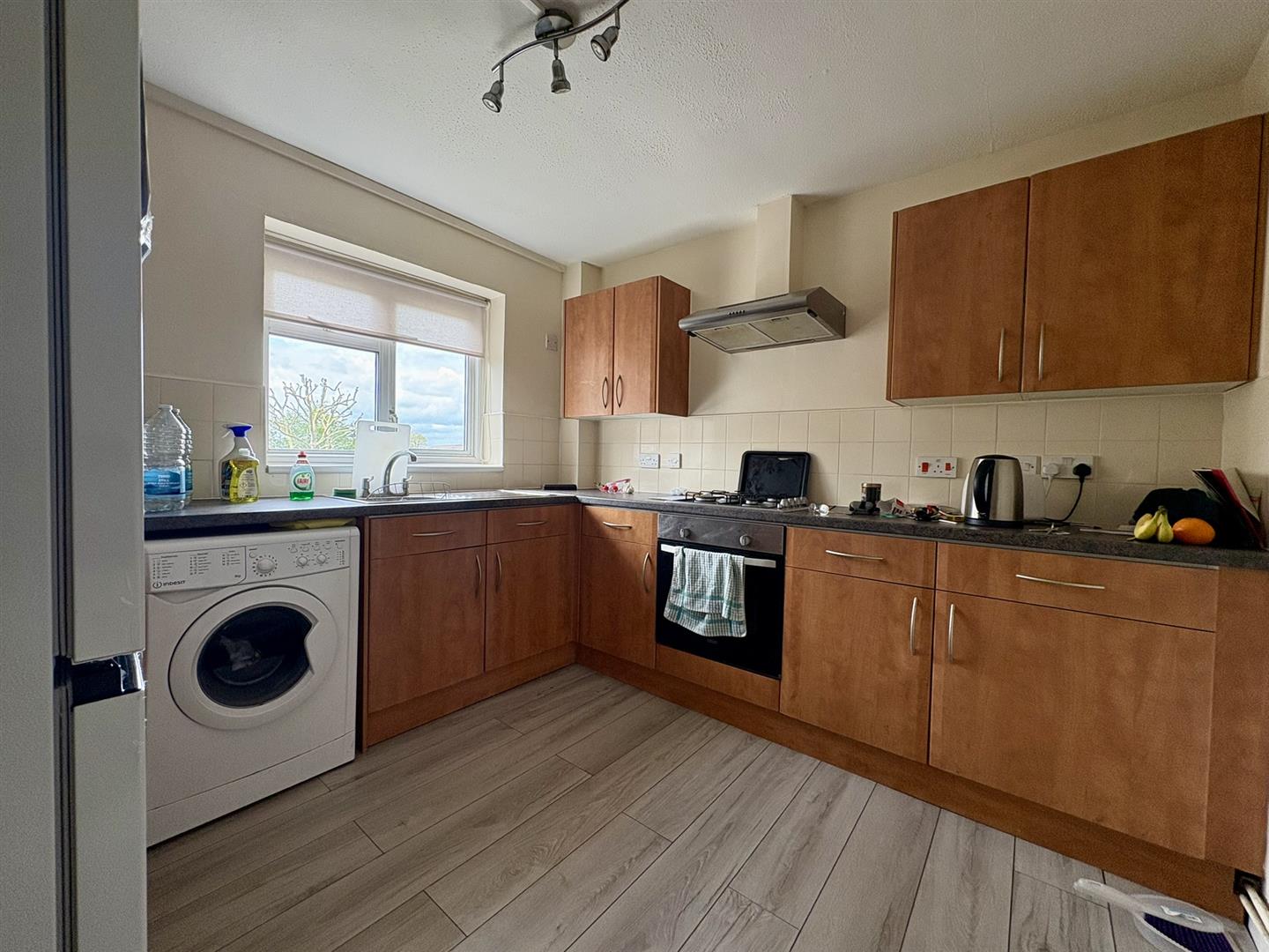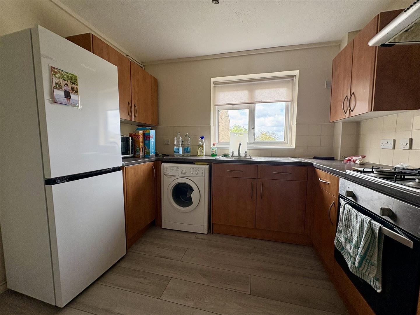 Double glazed window to front, wall and base units, single drainer sink, four ring gas hob, radiator, laminate flooring.
