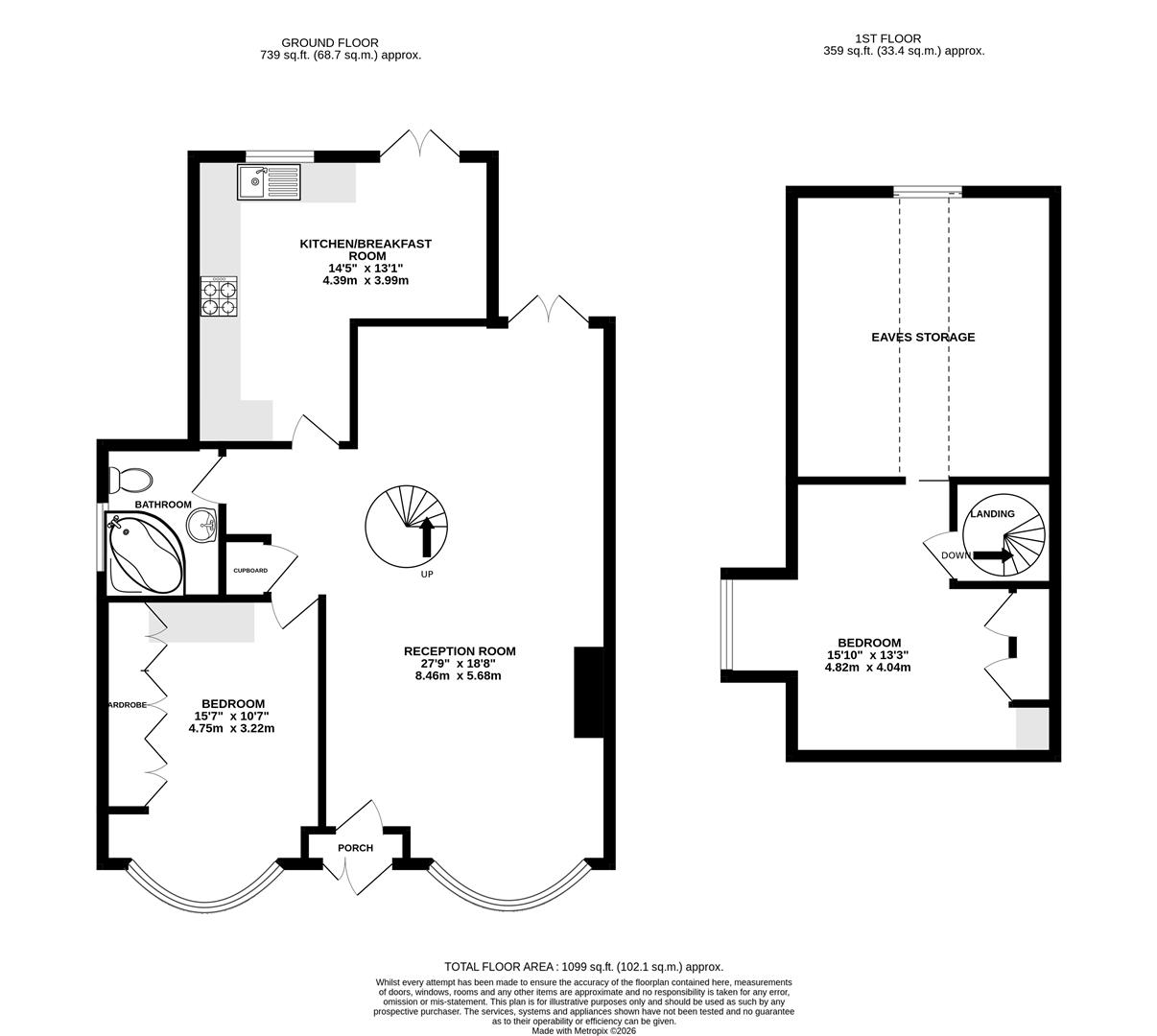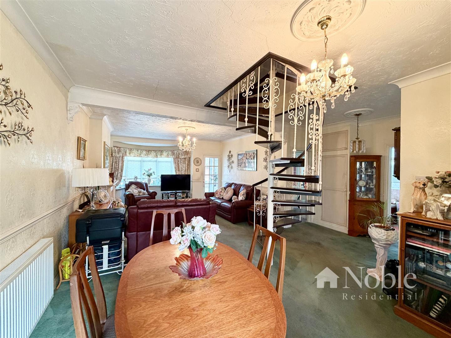 Double glazed bay window to front, double glazed French doors to rear, electric fireplace, two radiators, carpet, spiral staircase to first floor.