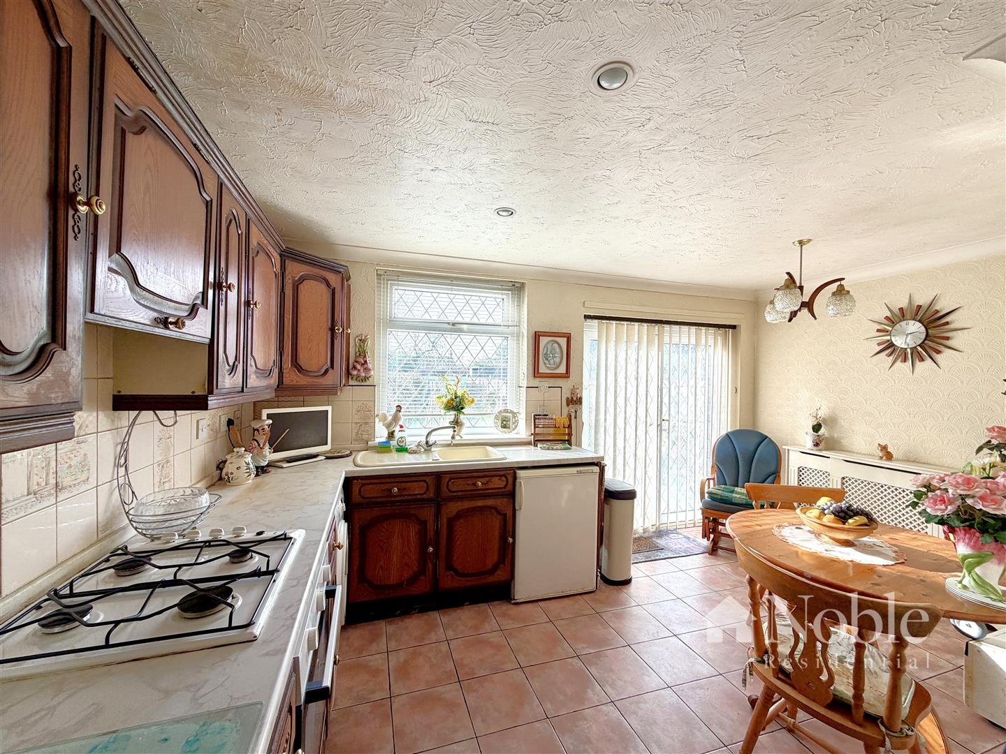 Wall and base units, single drainer sink, double glazed window to rear, four ring gas hob and oven, radiator, tiled flooring, double glazed French doors to rear.