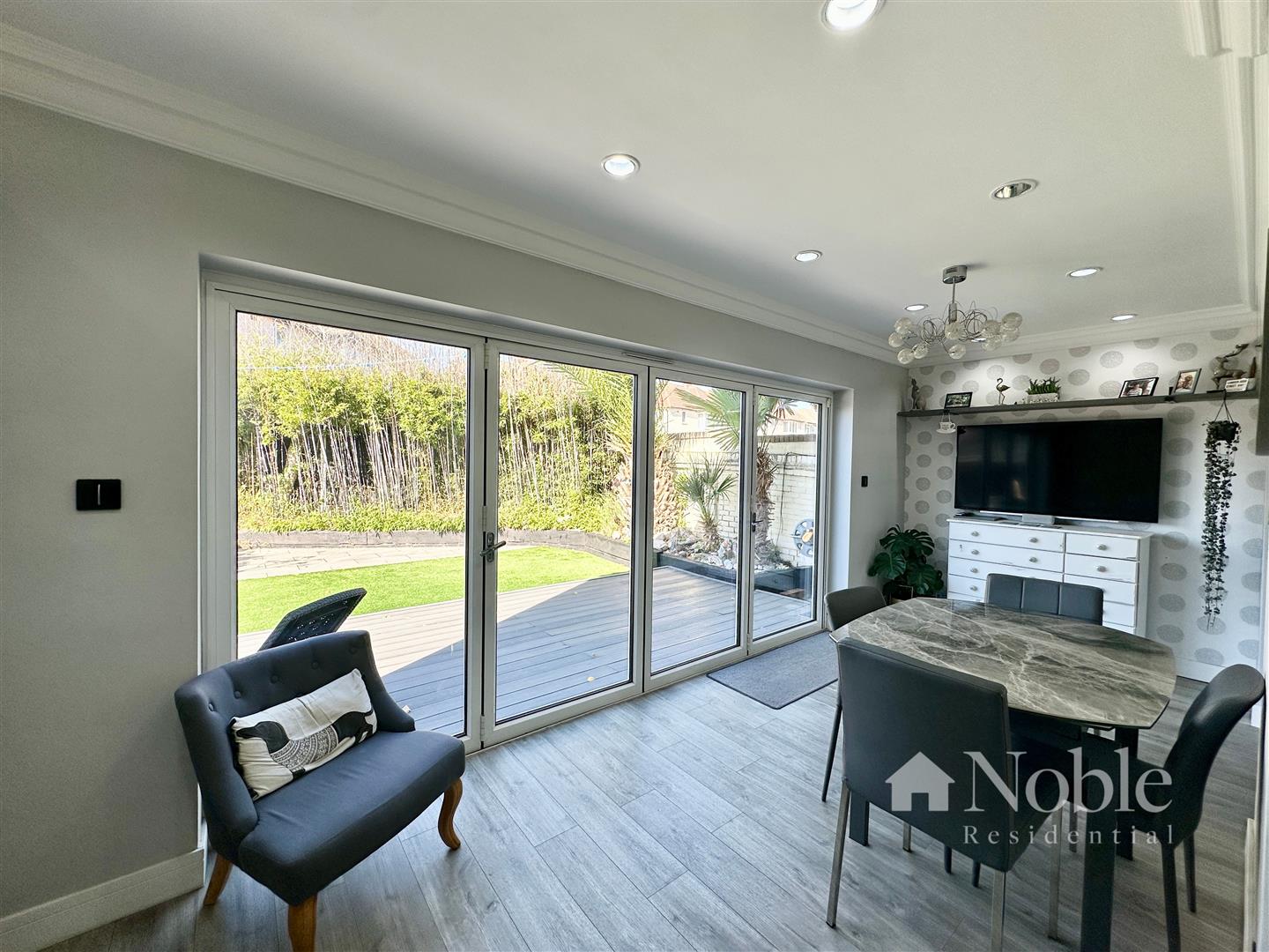 Double glazed Bi folding doors to rear, LVT flooring, coved ceiling, range of fitted wall and base units, two plinth heaters, gas hob, oven, extractor, integrated full height fridge and freezer, dishwasher, wine cooler and microwave, quartz work tops with inset 1 1/2 bowl sink, under stairs cupboard.