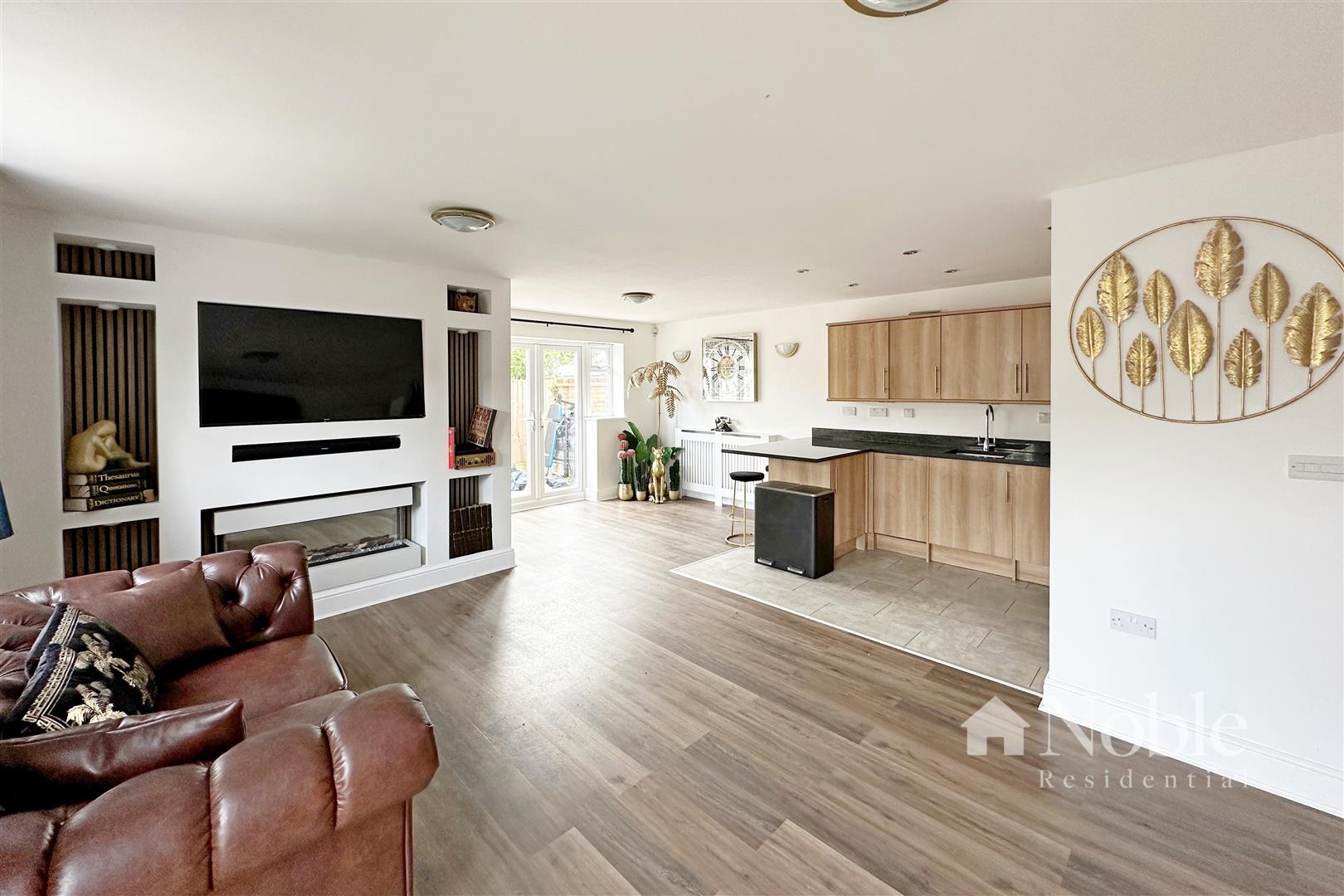 Double glazed French doors to side and rear, double glazed window to side, two radiators, laminate flooring, open plan to kitchen area.