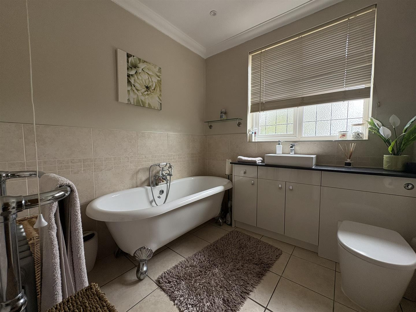 Spotlights, double glazed window to rear, tiled walls and flooring, freestanding bath, low level WC, vanity wash hand basin, radiator.