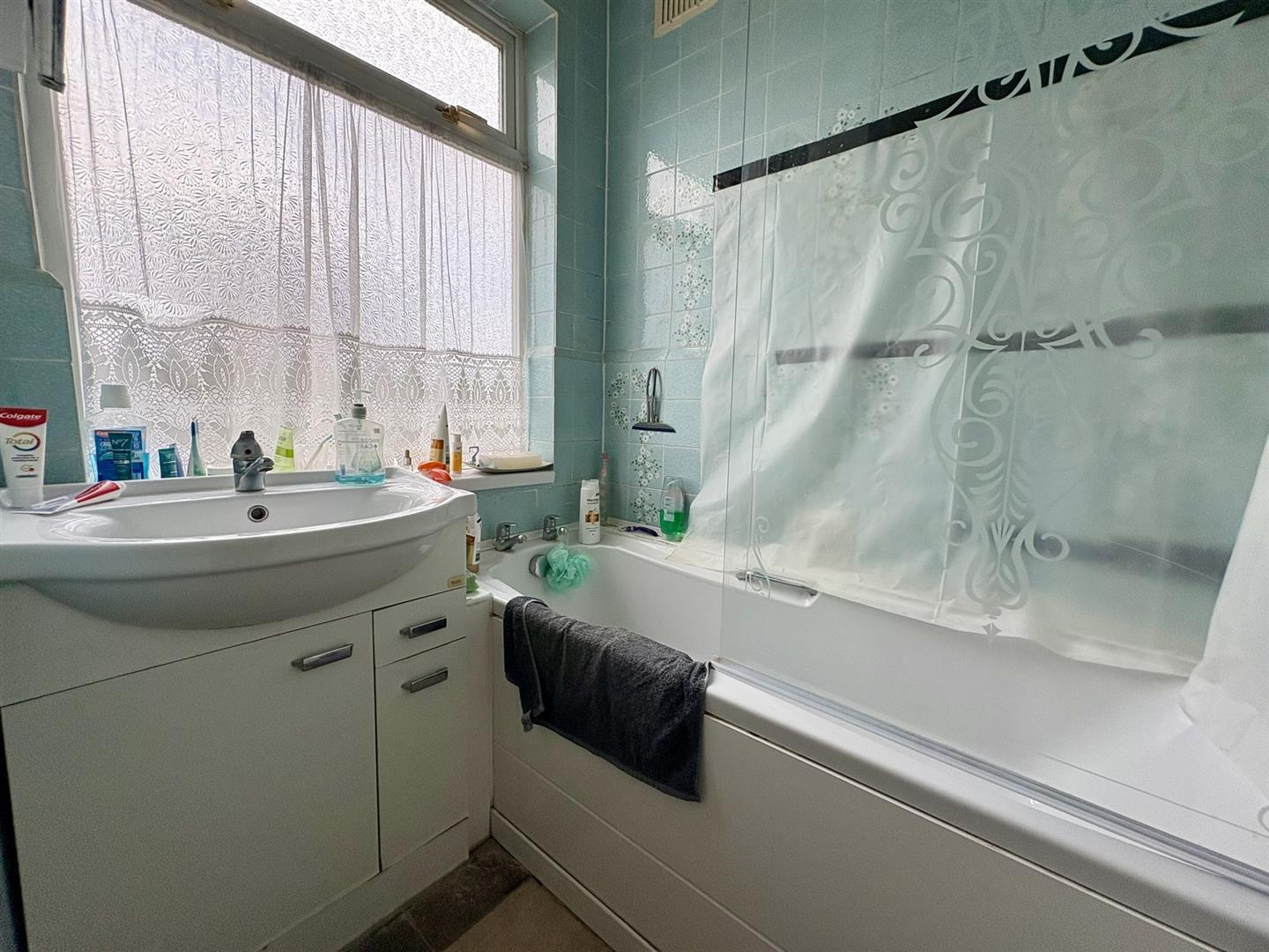 Double glazed window to rear, tiled walls and flooring, panelled bath, vanity hand wash basin, storage, heated towel rail.