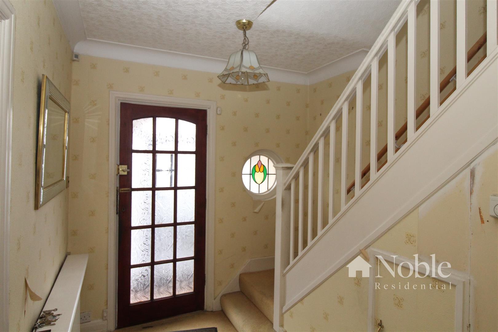 Door opening to porch, coved ceiling, carpet, radiator, stairs to first floor, under stairs cupboard, door to side.