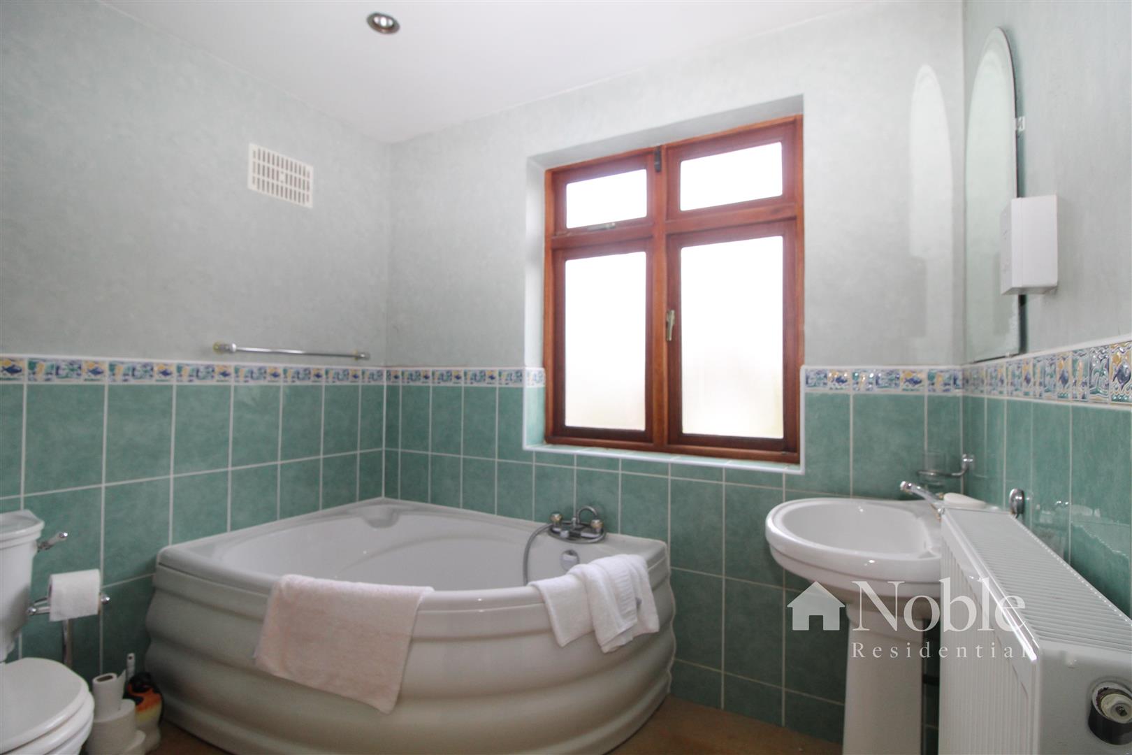 Frosted double glazed windows to side and rear, shower cubicle, low level WC, wash hand basin, corner bath, part tiled walls, radiator, carpet.