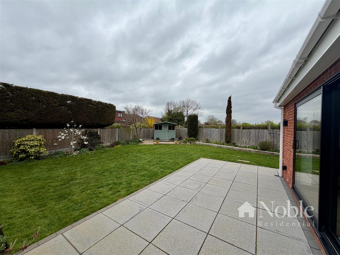 Side pedestrian access, patio area, lawn with surrounding flower beds, shed, outside power, light and tap.