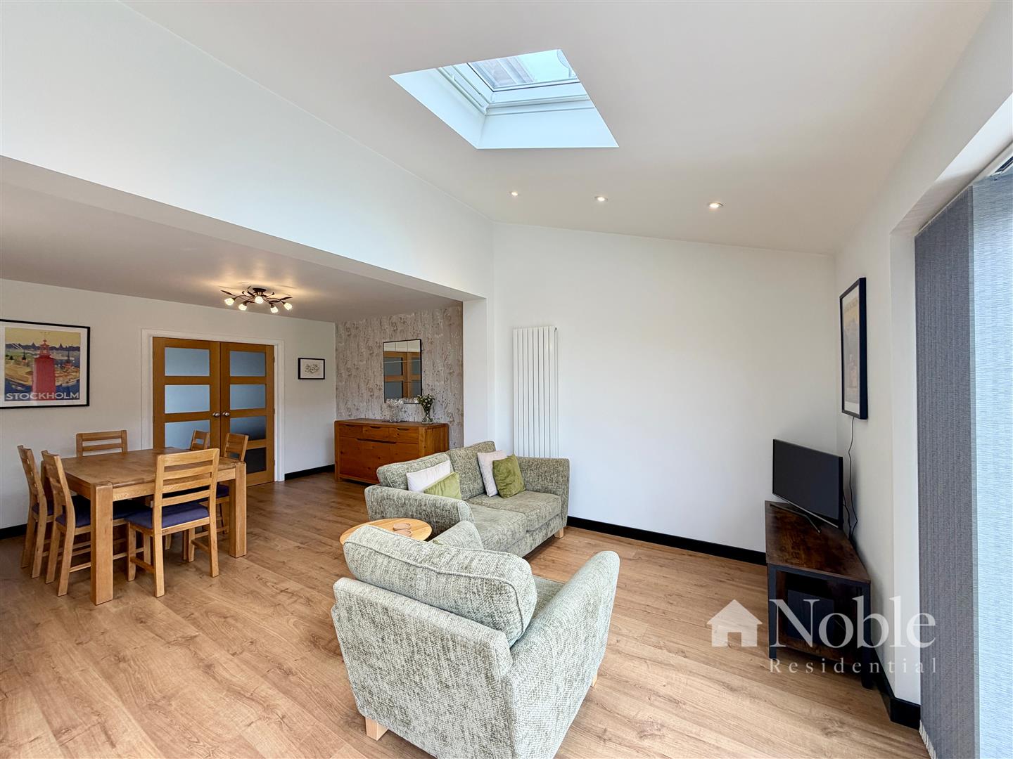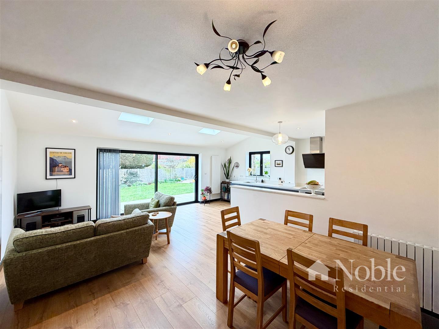 Double glazed sliding door to rear, double glazed window to side, two double glazed sky lights, three radiators, laminate flooring. Kitchen area includes base units with quartz work tops and inset sink, integrate dishwasher, fridge, induction hob, oven and extractor.