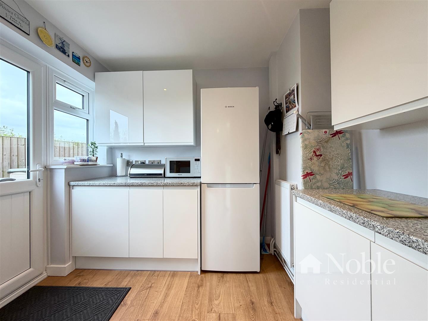 Double glazed window to side, double glazed door to side, wall and base units, boiler, plumbing for washing machine, radiator, laminate flooring.