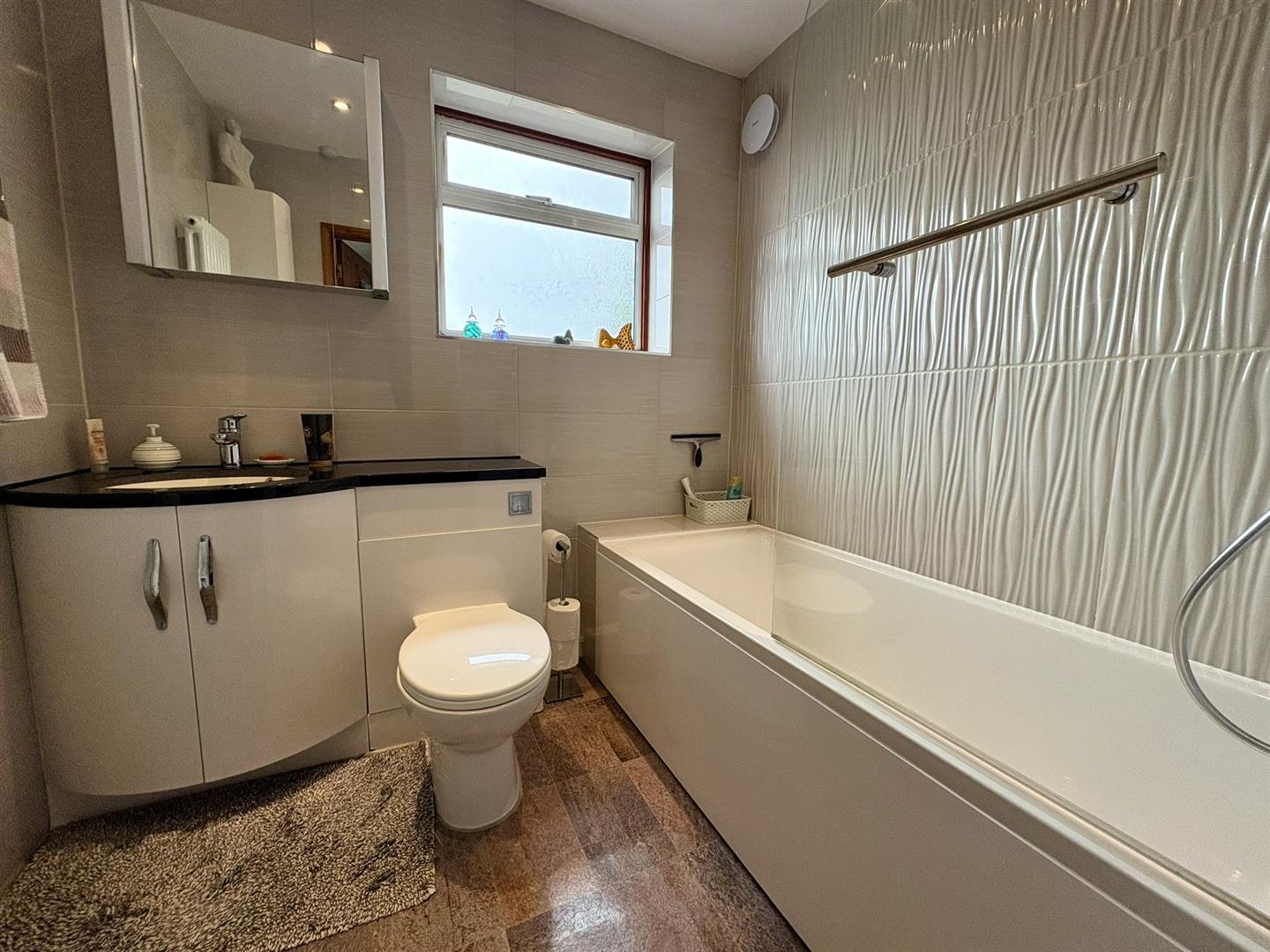 Tiled walls and flooring, double glazed window to rear, low level WC, panelled bath, vanity hand wash basin.