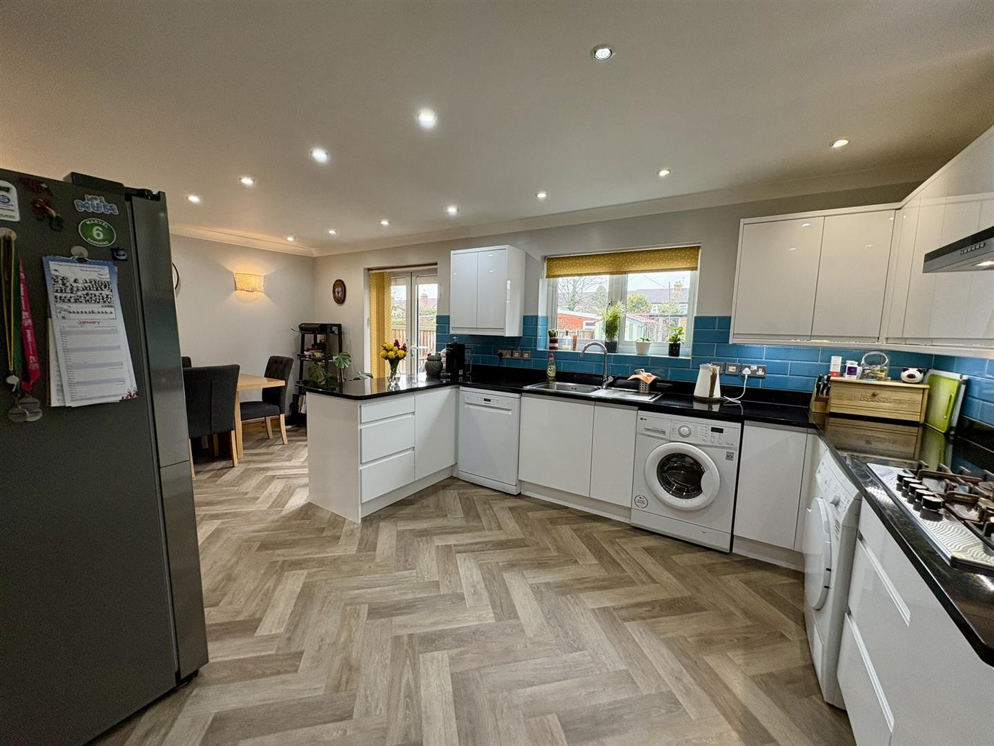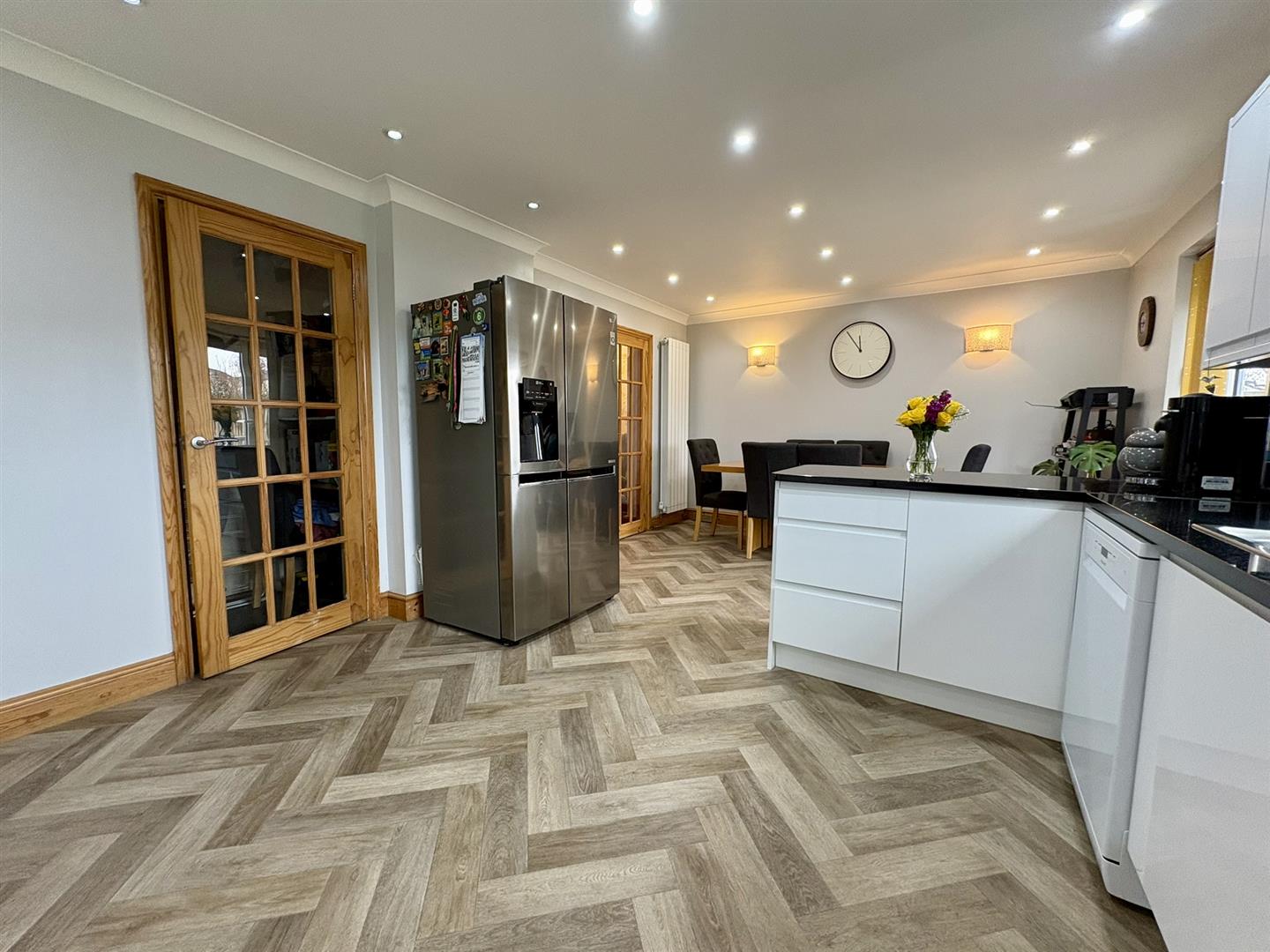 Spotlights, vinyl flooring, double glazed window to rear, French doors to rear, wall and base units, single drainer sink, five ring gas hob, double oven, radiator, door into pantry area.
