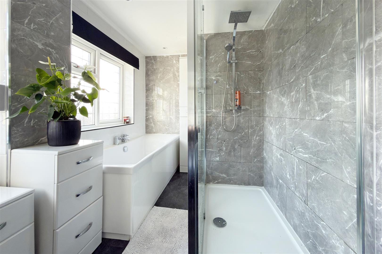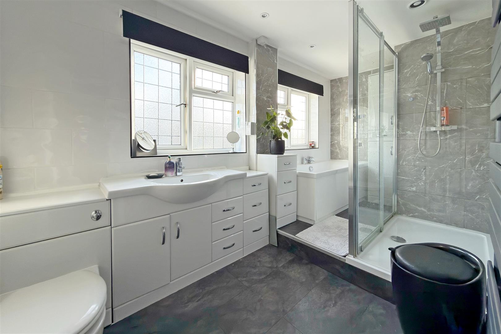 Two double glazed windows. Suite comprising of bath, separate shower cubicle with handheld and waterfall heads, low level wc and wash basin with drawers and cupboards beneath, smooth ceiling, spotlights, extractor, tiled walls, heated towel rail, vinyl flooring.