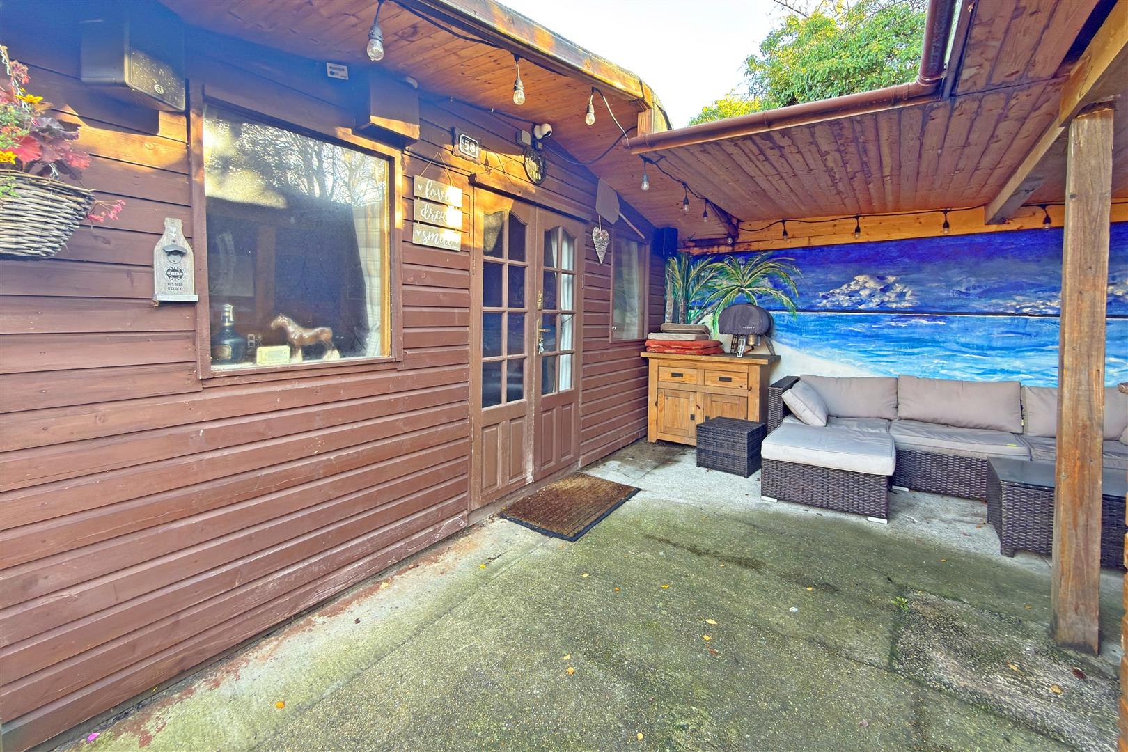To the direct rear of the property is a covered seating area with heaters and Indian sandstone slabs, outside power and lighting, footpath leading to the end of the garden where there is a further block paved seating area and entertaining area, outdoor bar, outbuilding and two sheds, artificial lawn area, pedestrian side access via gate.