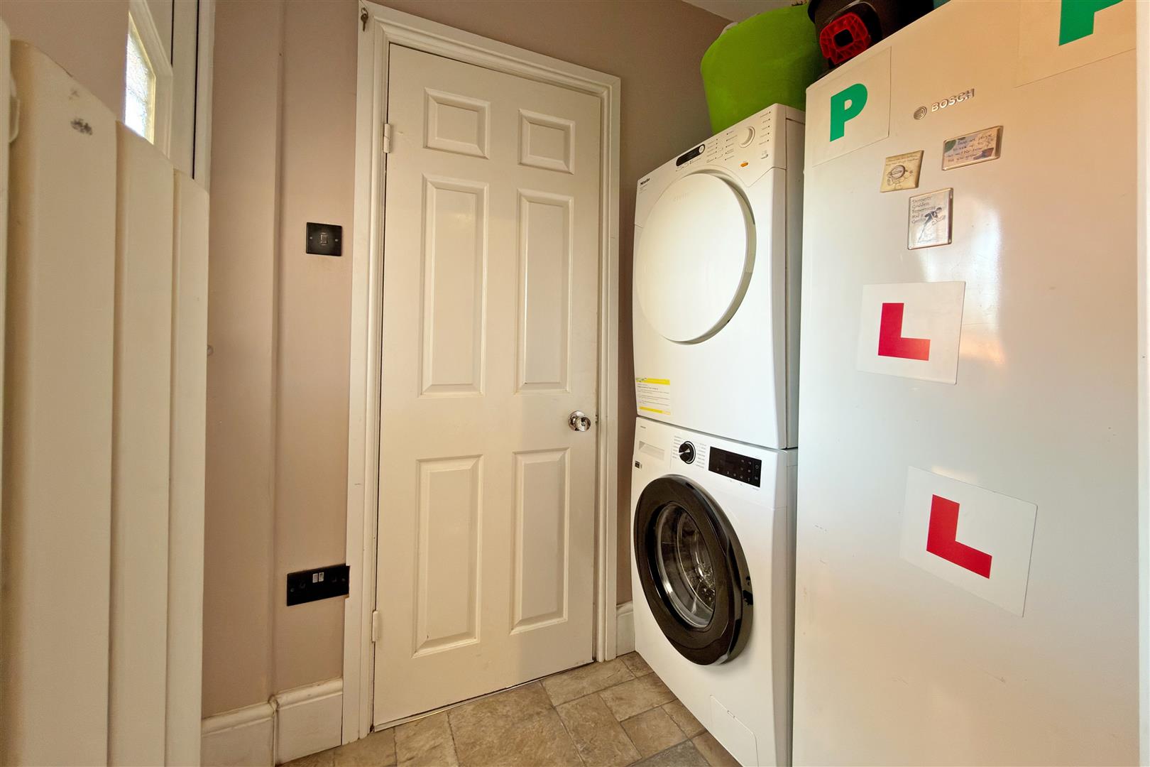 Double glazed window, double glazed door to rear garden. Smooth ceiling, spotlights, radiator, plumbing and power for washing machine and tumble dryer.