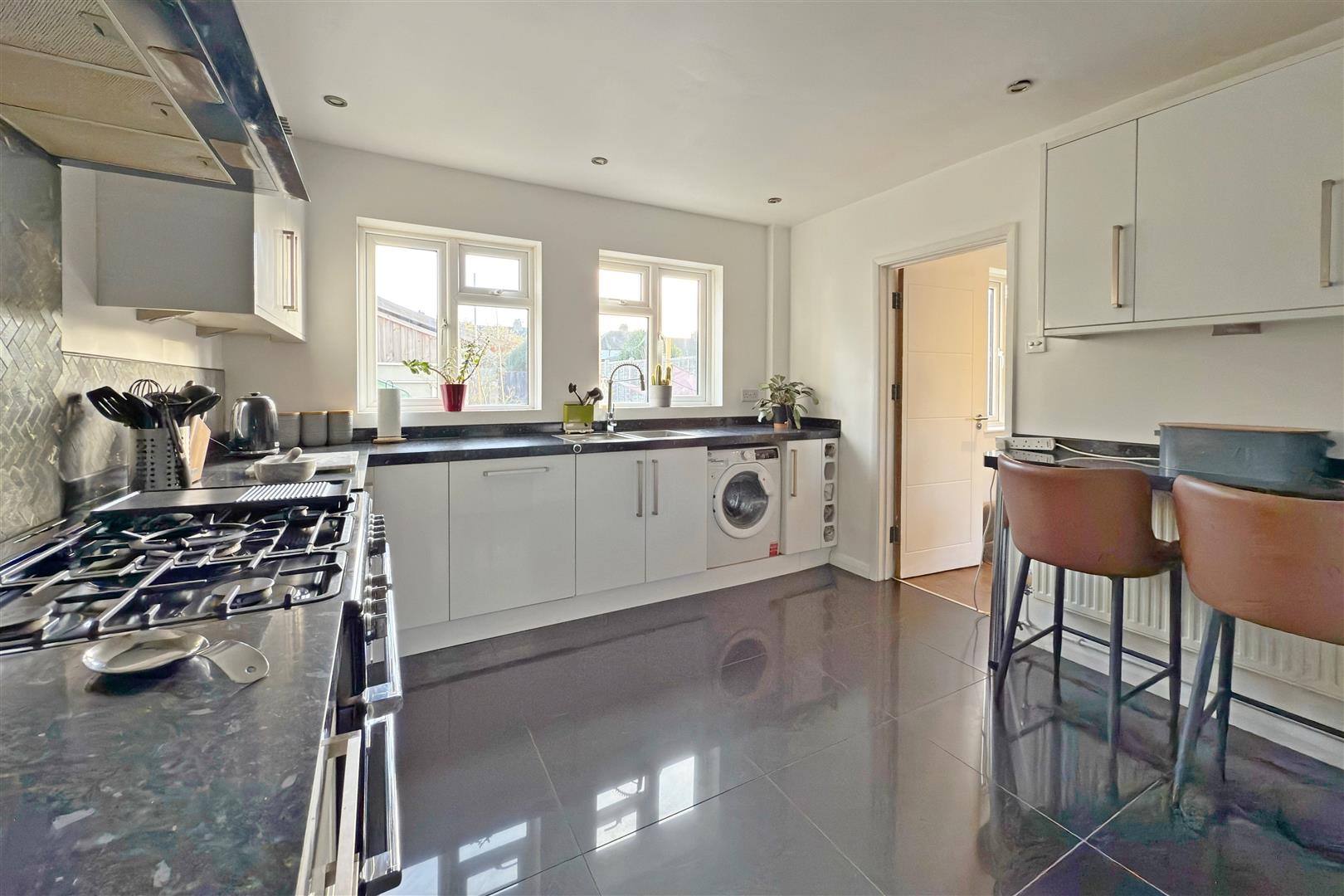 Two double glazed windows to one aspect, double glazed door to a second aspect. Range of gloss white base and eye level wall cabinets with black worktops, under cupboard lighting, breakfast bar, integrated full size dishwasher, part tiled walls, over head extractor hood, smooth ceiling, spotlights, radiator with thermostatic valve, storage cupboard, tiled floor.