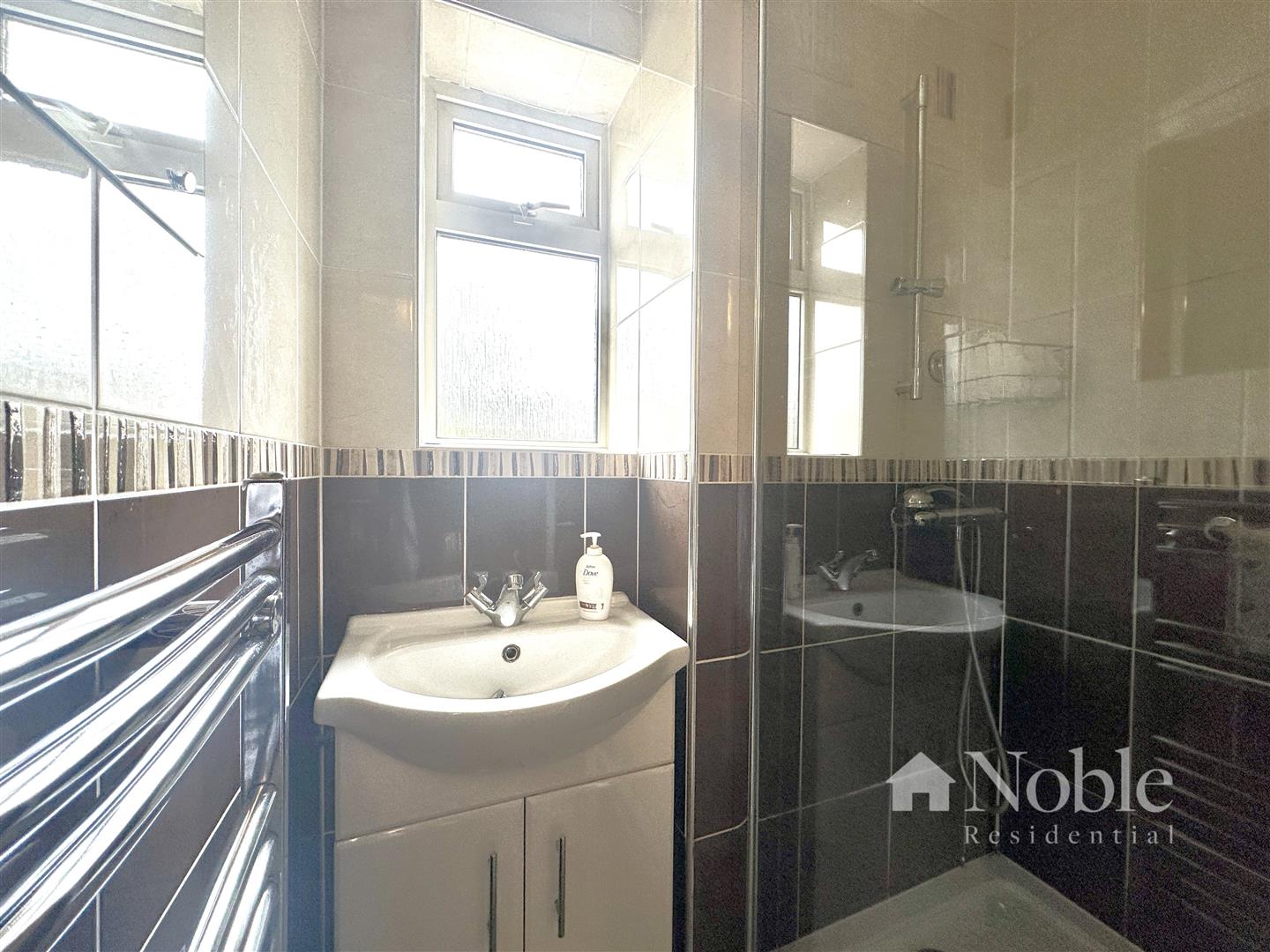 Frosted double glazed window to rear, vanity wash hand basin, walk in shower enclosure, heated towel rail, tiled walls, tiled flooring.