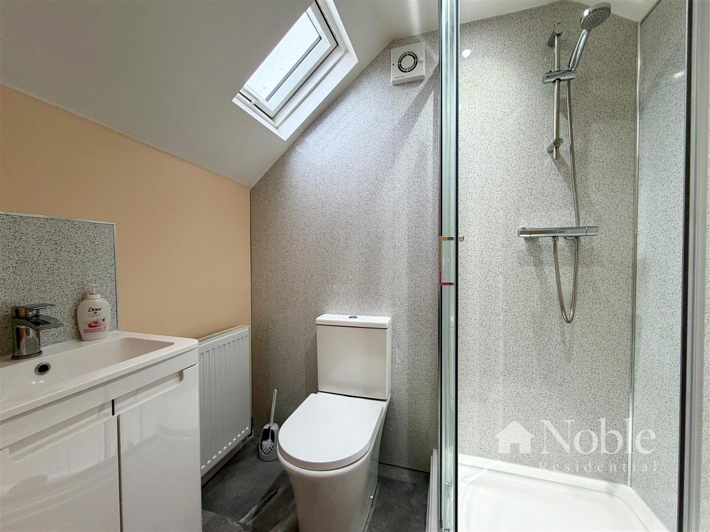 Double glazed sky light, low level WC, vanity wash hand basin, shower cubicle, extractor, radiator, tiled flooring.