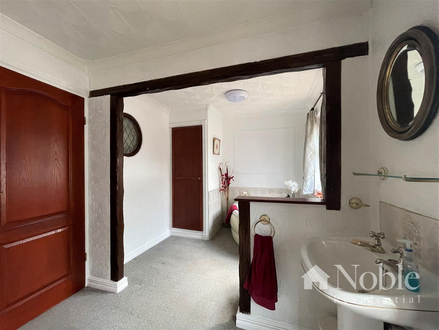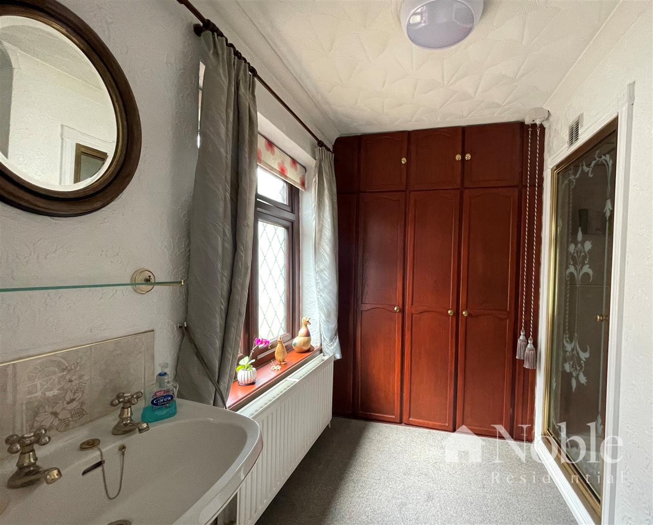 Frosted double glazed window to side, pedestal wash hand basin, low level WC, shower cubicle, corner bath, radiator, carpet, part tiled walls, storage cupboards.