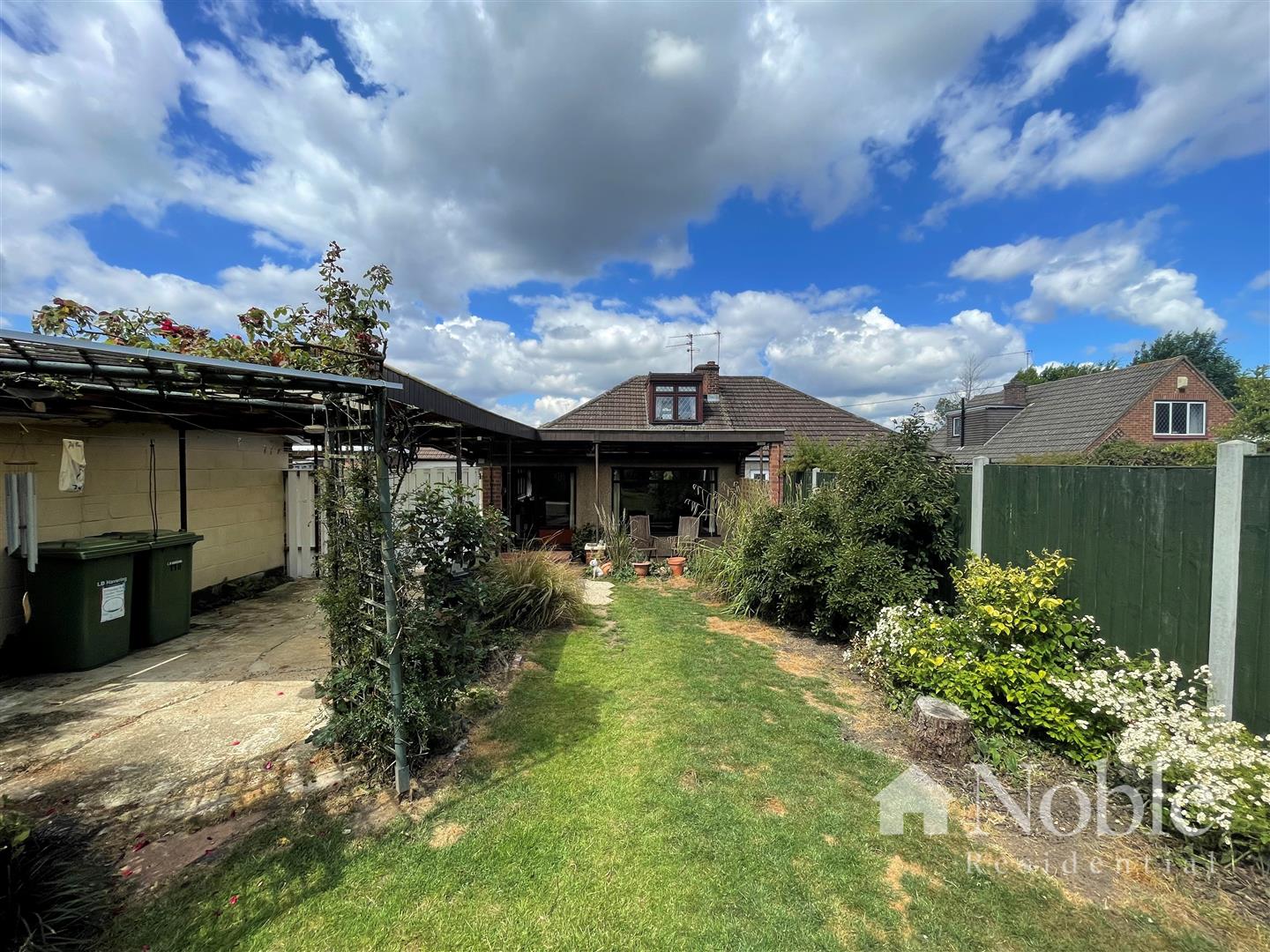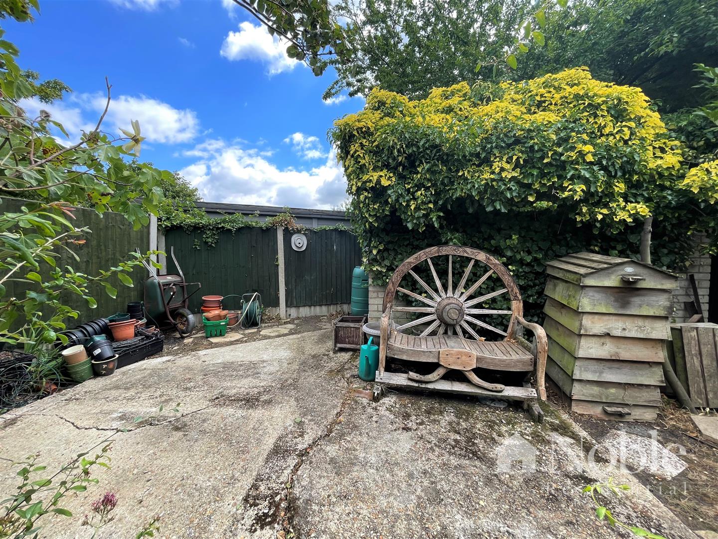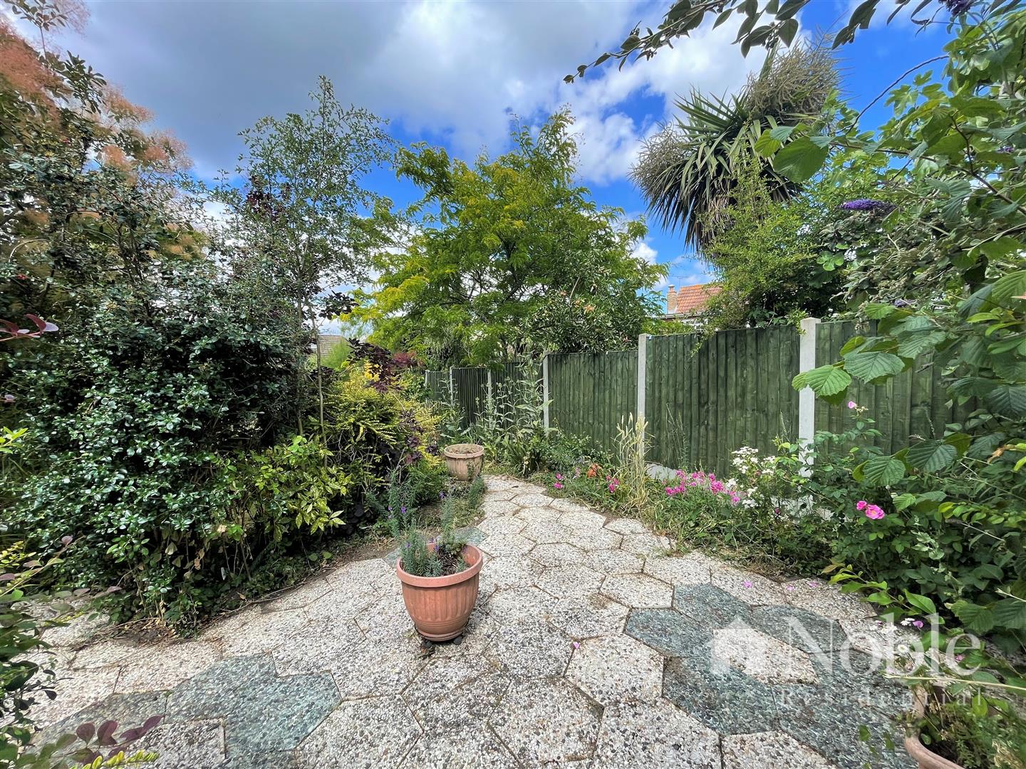 Patio area to the rear of propety with steps to lawn, various surrounding flower beds, additional patio area at rear of garden, shed, side pedestrian gate into garden.