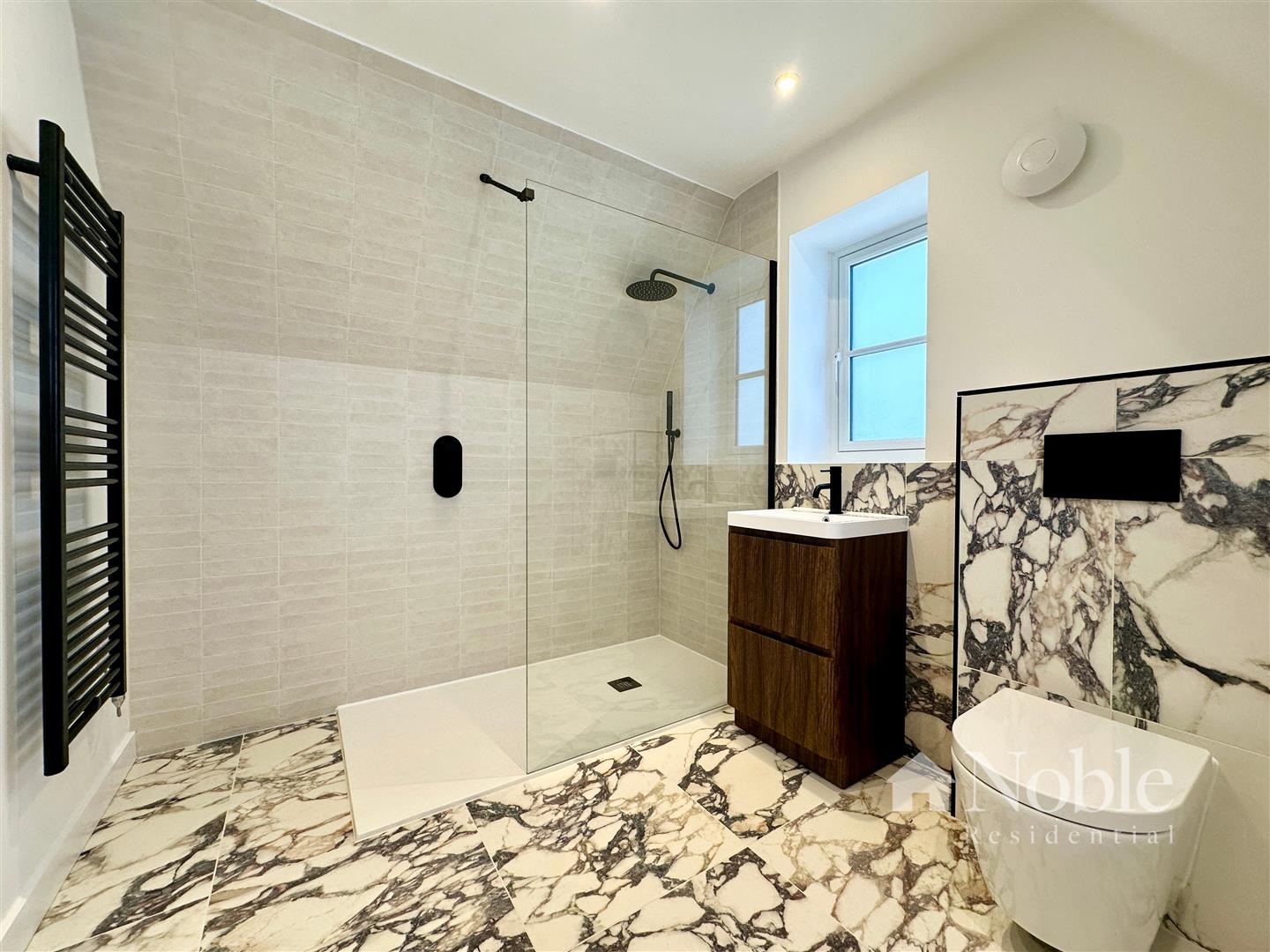 Frosted triple glazed windows to front and side, low level WC, vanity wash hand basin, walk in shower enclosure with rainfall shower head, heated towel rail, part tiled walls, tiled flooring with underfloor heating.