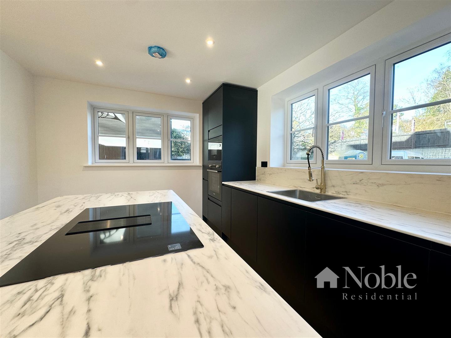Triple glazed window to front, two triple glazed windows to either side, range of fitted wall and base units, sink, oven, island with electric hob and breakfast bar and units under, range of fitted appliances including microwave, fridge freezer and dishwasher. Spot lights, luxury vinyl tile (LVT) flooring with underfloor heating. Open plan to reception room.
